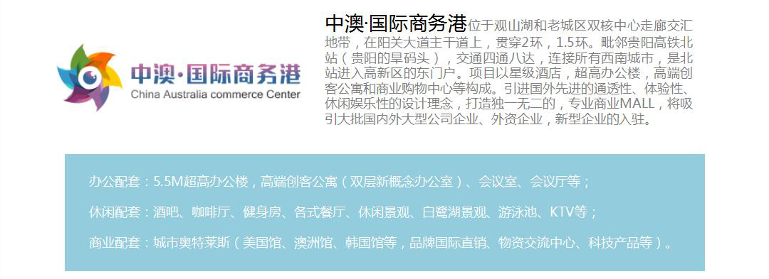 中澳·國際商務(wù)港位于觀(guān)山湖和老城區雙核中心走廊交匯地帶,在陽(yáng)關(guān)大道主干道上,貫穿2環(huán),1.5環(huán)。毗鄰貴陽(yáng)高鐵北站(貴陽(yáng)的旱碼頭),交通四通八達,連接所有西南城市,是北站進(jìn)入高新區的東門(mén)戶(hù)。項目以星級酒店,超高辦公樓,高端創(chuàng )客公寓和商業(yè)購物中心等構成。引進(jìn)國外先進(jìn)的通透性、體驗性、休閑娛樂(lè )性的設計理念,打造獨一無(wú)二的,專(zhuān)業(yè)商業(yè)MALL,將吸引大批國內外大型公司企業(yè)、外資企業(yè),新型企業(yè)的入駐。 辦公配